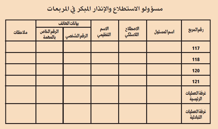 (3) تشكيل مسؤول استطلاع ورقابة في غرفة العمليات الميدانية ومسؤول عن الجميع في غرفة العمليات الرئيسية والتبادلية كما يلي: