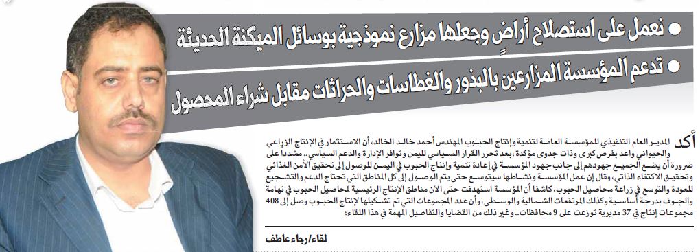 – أتمنى أن يستشعر القطاع الخاص المسؤولية الوطنية خلال هذه الفترة الحرجة التي يمر بها الوطن فلدينا مساحات شاسعة وبإمكانهم الدخول مع المؤسسة في شراكة للاستثمار فيها ونحن مستعدون لتجهيز الأرض وعمل الدراسات وحتى تقديم الدعم ببعض الإمكانيات فيما إذا توفر لنا دعم من بعض الدول المانحة، وعلى أصحاب رؤوس الأموال في بلادنا أن يستغلوا أموالهم في عمل نهضة تنموية زراعية وصناعية في اليمن، فجدوى الاستثمار في القطاع الزراعي كبيرة، خاصة وأن اليمن بدأت تتحرر من تبعية القرار السياسي.. ورغم الضغوطات السياسية التي كانت تمارس في السنوات الماضية وكذلك بسبب الاتفاقيات الدولية بعدم زراعة الحبوب، لكن القرار السياسي الآن تحرر وأصبح بيد الشعب اليمني وليس بيد أمريكا والسعودية، وبمقدور القطاع الخاص أن يعمل ويستثمر بكل حرية، كما وجدنا أن هناك من أصحاب رؤوس الأموال من هم حريصون على وطنهم وسيبادرون- كما وعدونا بذلك- إلى الدخول في هذه الشراكة للاستثمار في القطاع الزراعي.. هم كانوا في السابق يبحثون عن الربح السريع والسهل لأن العدوان وضع العراقيل ويحاول أن يدمر الاقتصاد الوطني وترتب على القطاع الخاص دفع مبالغ ومخاطر من الاستيراد للحبوب وغيرها ويواجهون عوائق من عدم توفر السيولة وارتفاع أجور التأمين وكلفة النقل.. إلخ، والآن أصبح الاستثمار في الداخل هو المجدي وخاصة في القطاع الزراعي الذي لا يحتاج سوى قوة إرادة ومبادرة فقط والبدء بالعمل، الأرض موجودة والإمكانيات موجودة والمياه موجودة والإرادة والقرار السياسي يدعم ويشجع، إذاً ما عليهم سوى البدء بالاستثمار في هذا القطاع الواعد.. كما نتمنى أن يضع الجميع جهودهم إلى جانب جهود المؤسسة في إعادة تنمية وإنتاج الحبوب في اليمن للوصول إلى تحقيق الأمن الغذائي وتحقيق الاكتفاء الذاتي سواءً كانوا مزارعين أو مواطنين.