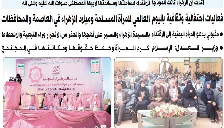 اقيمت أمس في العاصمة صنعاء وعدد من محافظات الجمهورية فعاليات احتفالية وثقافية بمناسبة اليوم العالمي للمرأة المسلمة وذكرى ميلاد الزهراء.