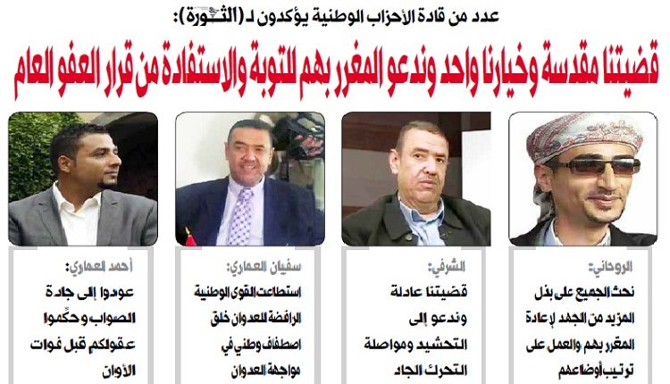 الروحاني: نحث الجميع على بذل المزيد من الجهد لإعادة المغرر بهم والعمل على ترتيب أوضاعهم الشرفي: قضيتنا عادلة وندعو إلى التحشيد ومواصلة التحرك الجاد سفيان العماري: استطاعت القوى الوطنية الرافضة للعدوان خلق اصطفاف وطني في مواجهة العدوان أحمد العماري: عودوا إلى جادة الصواب وحكِّموا عقولكم قبل فوات الأوان عبر أكثر من مصدر ومنبر حكومي، توالت … تابع قراءة عدد من قادة الأحزاب الوطنية يؤكدون لـ(الثورة):قضيتنا مقدسة وخيارنا واحد وندعو المغرر بهم للتوبة والاستفادة من قرار العفو العام