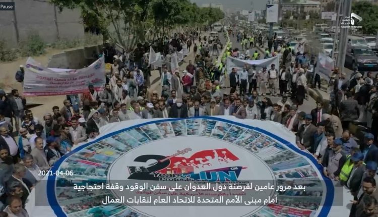 نظم الاتحاد العام لنقابات عمّال اليمن اليوم مسيرة حاشدة بصنعاء للتنديد بالصمت الأممي إزاء استمرار أعمال القرصنة البحرية واحتجاز سفن الوقود من قبل قوى تحالف العدوان بقيادة أمريكا.