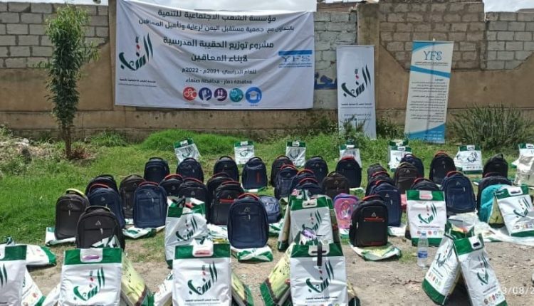وزعت مؤسسة الشعب الاجتماعية للتنمية بالتعاون مع مؤسسة مستقبل اليمن لرعاية وتأهيل المعاقين اليوم حقائب مدرسية لعدد 250 طالبا وطالبة من أبناء المعاقين بمحافظة ذمار .