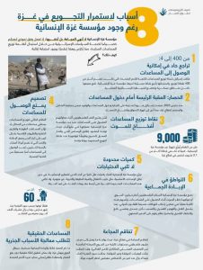 وأشار إلى أن هذه المؤسسة “توزع شهريا نحو 9 آلاف طن من المساعدات وهي لا تكفي لإعالة أكثر من 2.1 مليون شخص في القطاع”.