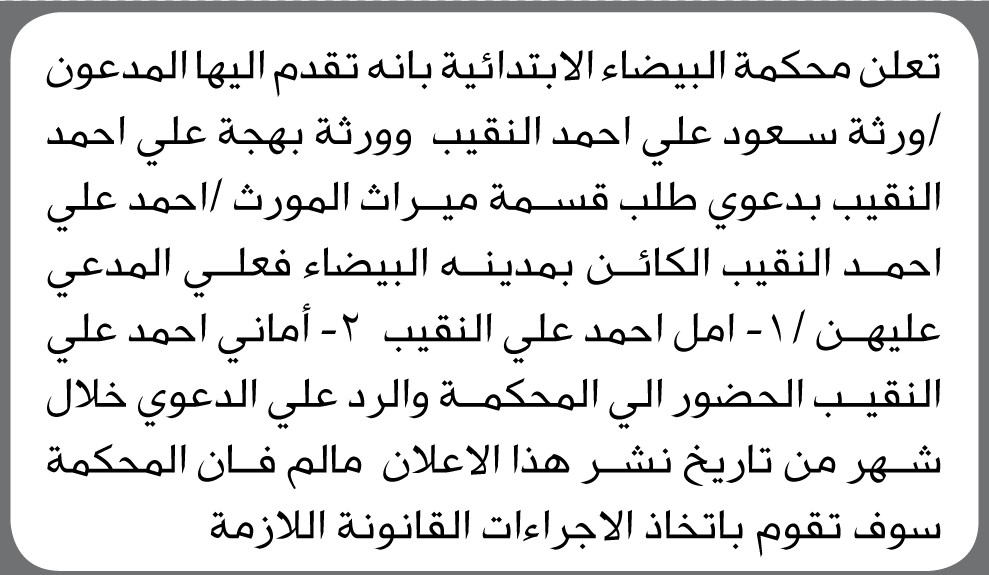تعلن محكمة البيضاء الابتدائية بأنه تقدم إليها المدعوون ورثة سعود علي النقيب وورثة بهجة النقيب بطلب قسمة ميراث إعلاناتمحاكم On يونيو 25, 2025 Share Share FacebookTwitterWhatsAppTelegramGoogle+البريد الإلكترونيPrint