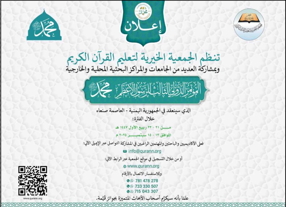 تنظم الجمعية الخيرية لتعليم القرآن الكريم المؤتمر الدولي الثالث للرسول الأعظم إعلاناتاخرى On يونيو 25, 2025 Share Share FacebookTwitterWhatsAppTelegramGoogle+البريد الإلكترونيPrint