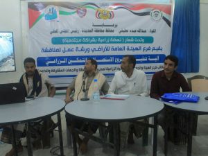 عقدت بمحافظة الحديدة، اليوم، ورشة عمل إضافية حول آلية تنفيذ مشروع الاستصلاح والتمكين الزراعي، نظمها مكتب فرع الهيئة العامة للأراضي والمساحة والتخطيط العمراني بالتنسيق مع السلطة المحلية وفرع الإتحاد التعاوني الزراعي بالمحافظة.