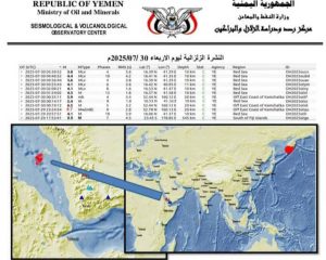 سجلت محطات مركز رصد ودراسة الزلازل والبراكين بذمار اليوم ثمان هزات أرضية من البحر الأحمر متفاوتة القوة الزلزالية بين 2.4 – 4.4 درجة على مقياس ريختر.