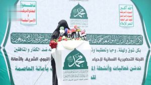 دشنت اللجنة التحضيرية النسائية للمولد النبوي الشريف بأمانة العاصمة، اليوم، فعاليات وأنشطة ذكرى المولد النبوي على صاحبه وآله أفضل الصلاة وأتم التسليم، تحت شعار الآية الكريمة :”يَا أَيُّهَا النَّبِيُّ جَاهِدِ الْكُفَّارَ وَالْمُنَافِقِينَ وَاغْلُظْ عَلَيْهِمْ وَمَأْوَاهُمْ جَهَنَّمُ وَبِئْسَ الْمَصِيرُ”.
