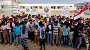 نظم القطاع التربوي بمديرية الصليف في محافظة الحديدة، اليوم، وقفة طلابية لمدارس المديرية تضامناً مع الشعب الفلسطيني في قطاع غزة، وتنديداً بجرائم العدو الصهيوني الأمريكي والحصار والتجويع الممنهج بحق أبناء القطاع.