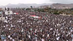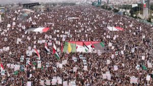 وأعلنت الحشود أن تهديدات ومؤامرات الأعداء وأدواتهم لا ترهب الشعب اليمني ولن تثنيه عن موقفه الديني والأخلاقي والإنساني في نصرة ومساندة الشعب الفلسطيني حتى إيقاف العدوان ورفع الحصار عن قطاع غزة، مهما كانت التحديات والتضحيات.