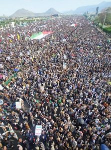 وأوضح بيان صادر عن المسيرة، ألقاه مفتي محافظة البيضاء العلامة حسين الهدار، أنه “استشعاراً لمسؤوليتنا الدينية والإنسانية والأخلاقية، نستمر في خروجنا الأسبوعي في مسيرات مليونية جهاداً في سبيل لله، وابتغاء لمرضاته، ونصرة ومساندة لإخواننا في غزة، الذين يتعرضون لأبشع جرائم الإبادة في هذا العصر على يد المجرمين الصهاينة، ونصرة للمسجد الأقصى المبارك”.