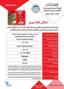 حذرت الهيئة اليمنية للمواصفات والمقاييس وضبط الجودة من تداول واستهلاك منتج “أرز بسمتي سيلا طويل الحبة” ماركة ROYAL GOLDEN – Ali Baba.