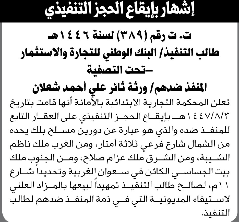 تعلن المحكمة التجارية بالأمانة أنها قامت بإيقاع الحجز التنفيذي على العقار التابع للمنفذ ضدهم ورثة ثائر شعلان إعلاناتمحاكم On سبتمبر 2, 2025 Share Share FacebookTwitterWhatsAppTelegramGoogle+البريد الإلكترونيPrint