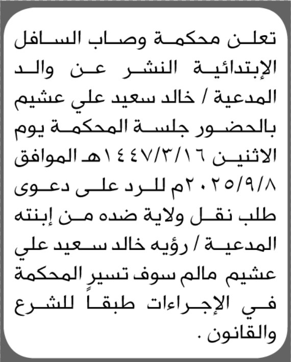 تعلن محكمة وصاب السافل أن على الأخ خالد عشيم الحضور الى المحكمة إعلاناتمحاكم On سبتمبر 4, 2025 Share Share FacebookTwitterWhatsAppTelegramGoogle+البريد الإلكترونيPrint