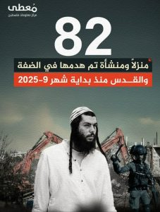 وأوضح “مُعطى”، أن عمليات الهدم شملت مساكن ومنشآت تجارية وزراعية، ما أدى إلى تهجير عدد من العائلات الفلسطينية وفقدانهم لمصدر رزقهم وممتلكاتهم.