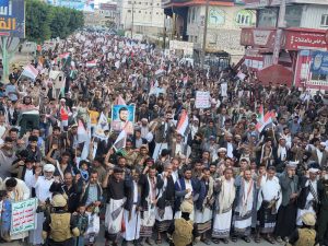 ورفع المشاركون الأعلام اليمنية والفلسطينية، ورددوا شعارات وهتافات تعبّر عن التضامن مع الشعب الفلسطيني في غزة، وتجديد العهد مع قضايا الأمة، وتؤكد على التمسّك بالقيم الوطنية والدينية والانسانية، وعلى استمرار الدعم الشعبي للقضية الفلسطينية، إلى جانب القيادة الثورية والسياسية والعسكرية، مؤكدين أن الموقف اليمني المساند لغزة هو موقف إيماني وديني ثابت لن يتغير أمام أي تحديات، ورافضاً كل أشكال التخاذل والتطبيع.