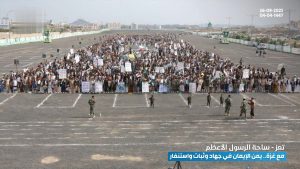 وأوضح بيان صادر عن مسيرات محافظة تعز، أنه استجابة لله سبحانه وتعالى، وجهاداً في سبيله وابتغاءً لمرضاته نستمر في خروجنا الأسبوعي في مسيراتنا المليونية نصرة للشعب الفلسطيني المسلم المظلوم ووفاءً لمجاهديه الأعزاء.