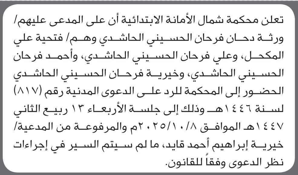 تعلن محكمة شمال الأمانة الابتدائية أن على المدعي عليهم ورثة دحان الحاشدي الحضور الى المحكمة إعلاناتمحاكم On أكتوبر 1, 2025 Share Share FacebookTwitterWhatsAppTelegramGoogle+البريد الإلكترونيPrint