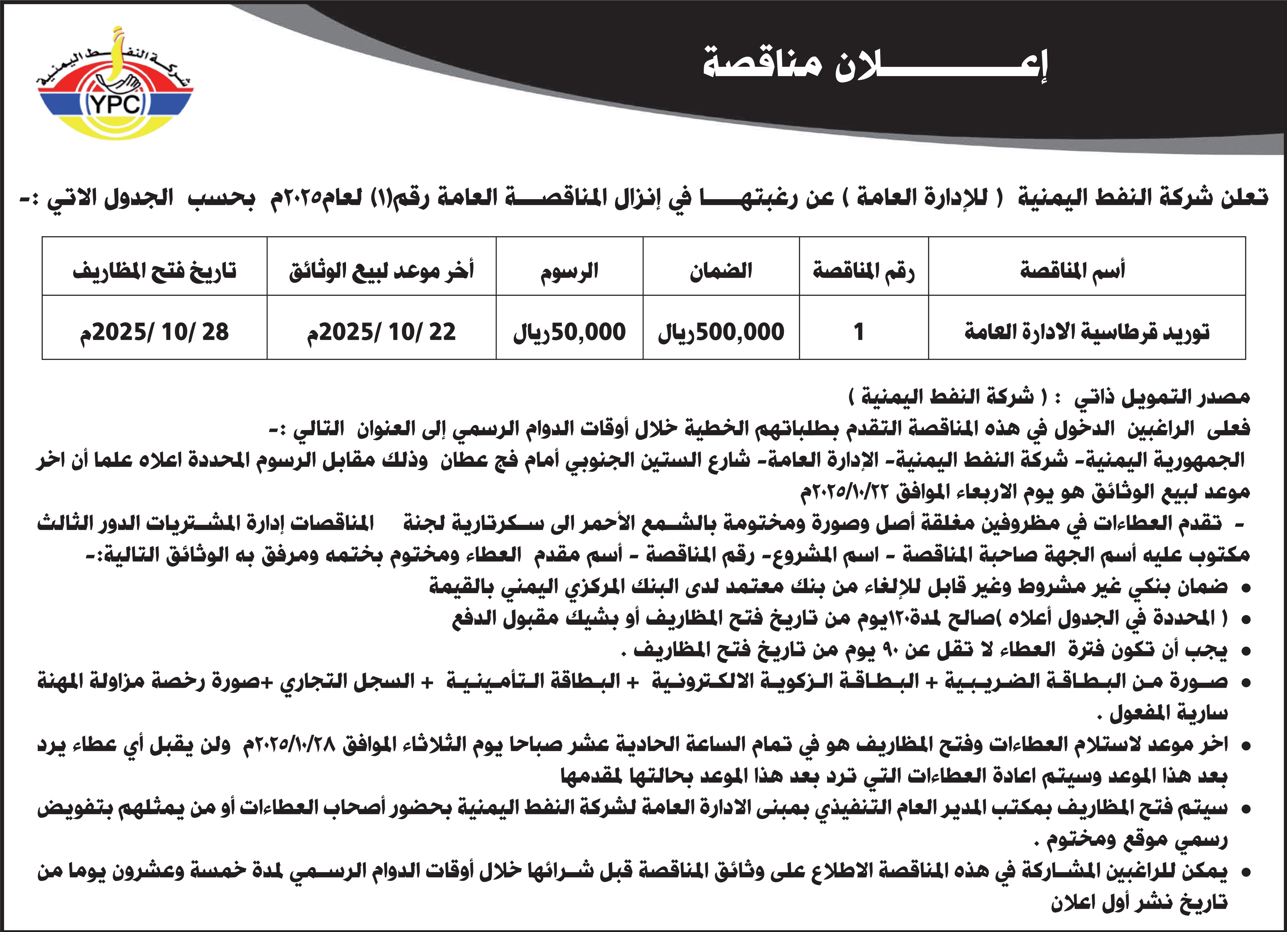 تعلن شركة النفط اليمنية رغبتها في إنزال مناقصة إعلاناتمناقصات On أكتوبر 1, 2025 Share Share FacebookTwitterWhatsAppTelegramGoogle+البريد الإلكترونيPrint