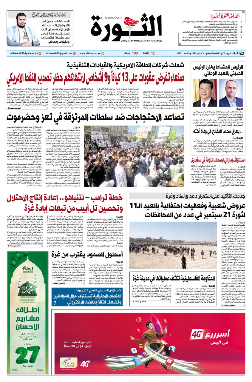 الصحيفة الورقية صحيفة الثورة الاربعاء 9 ربيع الاخر 1447 – 1 اكتوبر 2025 On سبتمبر 30, 2025 Share View Fullscreen Share FacebookTwitterWhatsAppTelegramGoogle+البريد الإلكترونيPrint