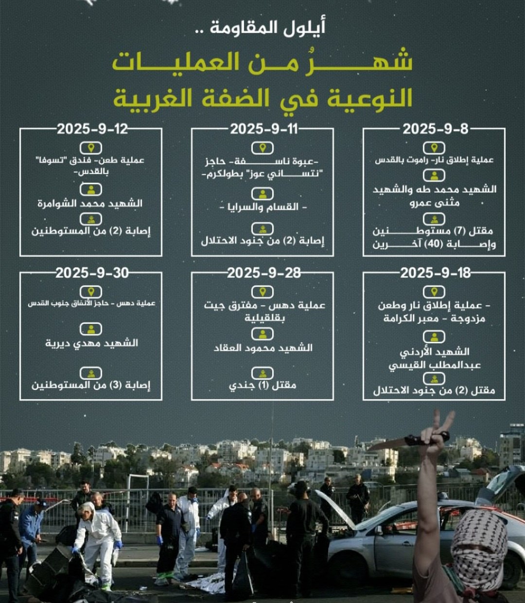 شهد شهر سبتمبر 2025 سلسلة من العمليات النوعية التي نفذتها المقاومة الفلسطينية في الضفة الغربية، مستهدفة قوات العدو والمستوطنين، وأسفرت عن سقوط قتلى وجرحى بينهم،