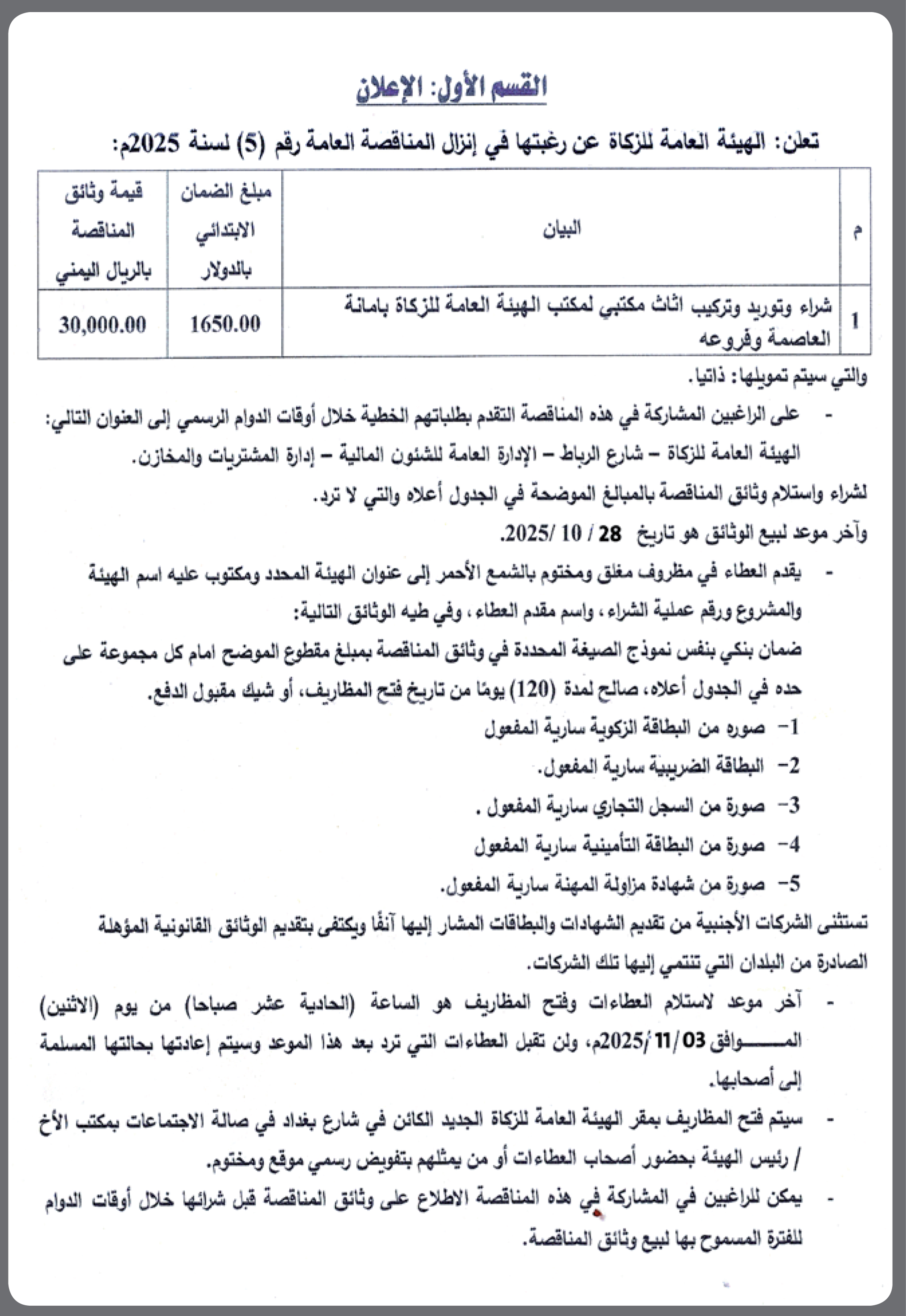 تعلن الهيئة العامة للزكاة عن رغبتها في انزال المناقصة العامة رقم 5 لسنة 2025 إعلاناتمناقصات On أكتوبر 1, 2025 Share Share FacebookTwitterWhatsAppTelegramGoogle+البريد الإلكترونيPrint