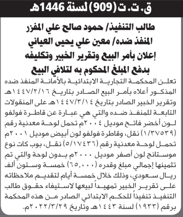 تعلن المحكمة التجارية بالامانة عن أمر البيع للمنقولات الخاصة بالمنفذ ضده معين العياني إعلاناتمحاكم On أكتوبر 1, 2025 Share Share FacebookTwitterWhatsAppTelegramGoogle+البريد الإلكترونيPrint