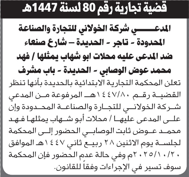 تعلن المحكمة التجارية بالحديدة ان على المدعى عليه فهد الوصابي الحضور إلى المحكمة إعلاناتمحاكم On أكتوبر 1, 2025 Share Share FacebookTwitterWhatsAppTelegramGoogle+البريد الإلكترونيPrint