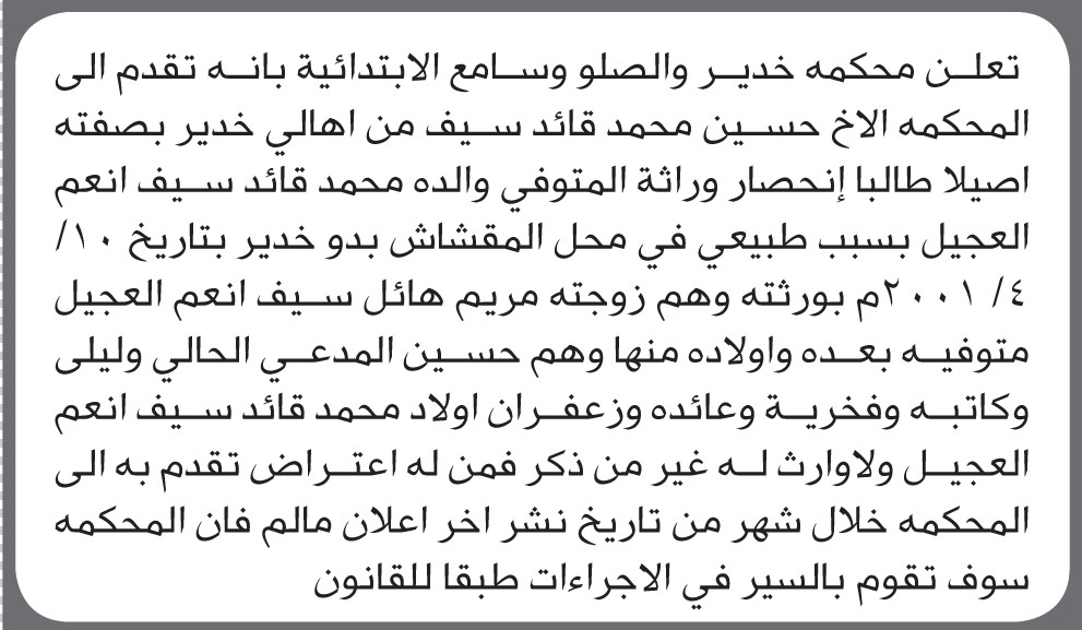 تقدم الأخ حسين محمد الى محكمة خدير والصلو وسامع بطلب إصدار حكم انحصار وراثة لوالده المتوفي إعلاناتمحاكم On أكتوبر 1, 2025 Share Share FacebookTwitterWhatsAppTelegramGoogle+البريد الإلكترونيPrint