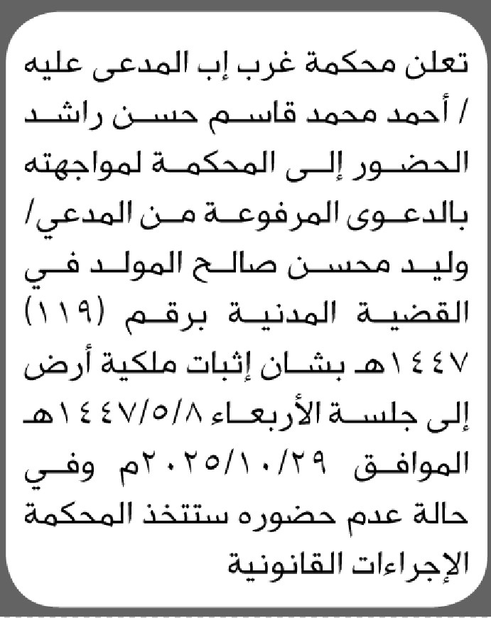 تعلن محكمة غرب إب أن على المدعى عليه أحمد محمد قاسم الحضور إلى المحكمة إعلاناتمحاكم On أكتوبر 1, 2025 Share Share FacebookTwitterWhatsAppTelegramGoogle+البريد الإلكترونيPrint