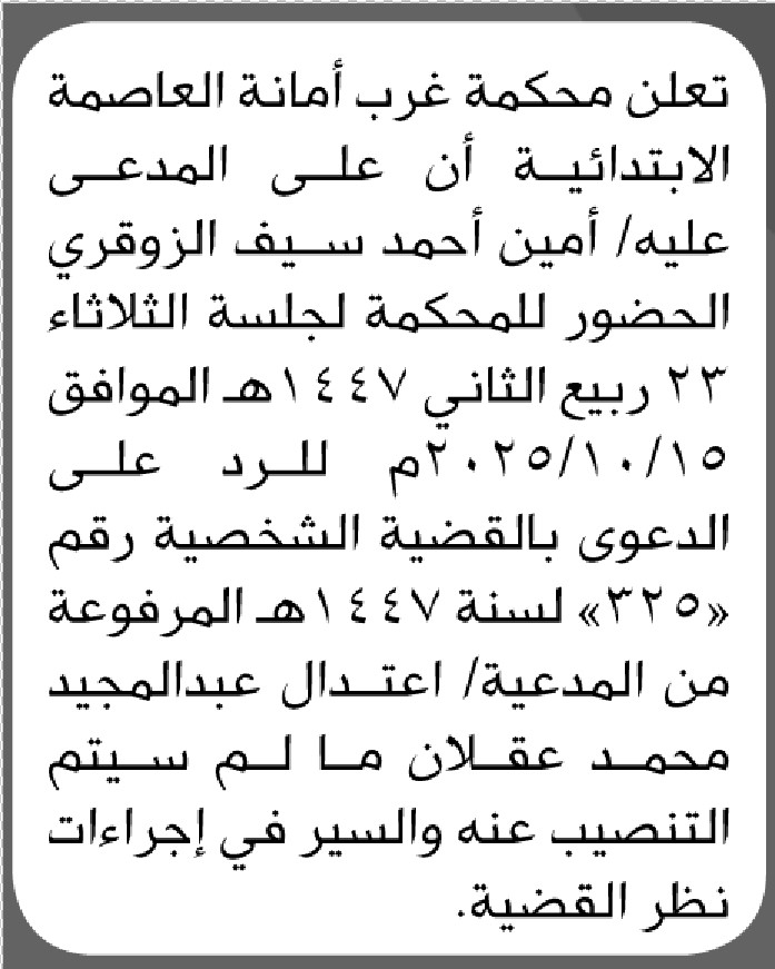تعلن محكمة غرب الأمانة أن على المدعى عليه أمين أحمد الزوقري الحضور إلى المحكمة إعلاناتمحاكم On أكتوبر 1, 2025 Share Share FacebookTwitterWhatsAppTelegramGoogle+البريد الإلكترونيPrint