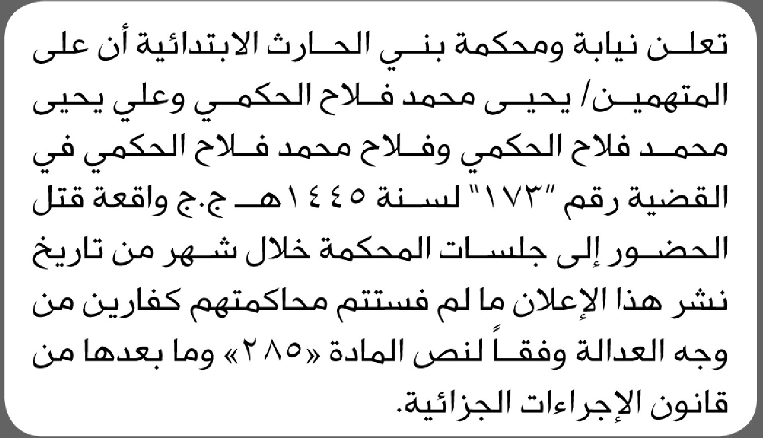 تعلن نيابة ومحكمة بني الحارث أن على المتهمين يحيى الحكمي وآخرين الحضور إلى المحكمة إعلاناتمحاكم On أكتوبر 2, 2025 Share Share FacebookTwitterWhatsAppTelegramGoogle+البريد الإلكترونيPrint