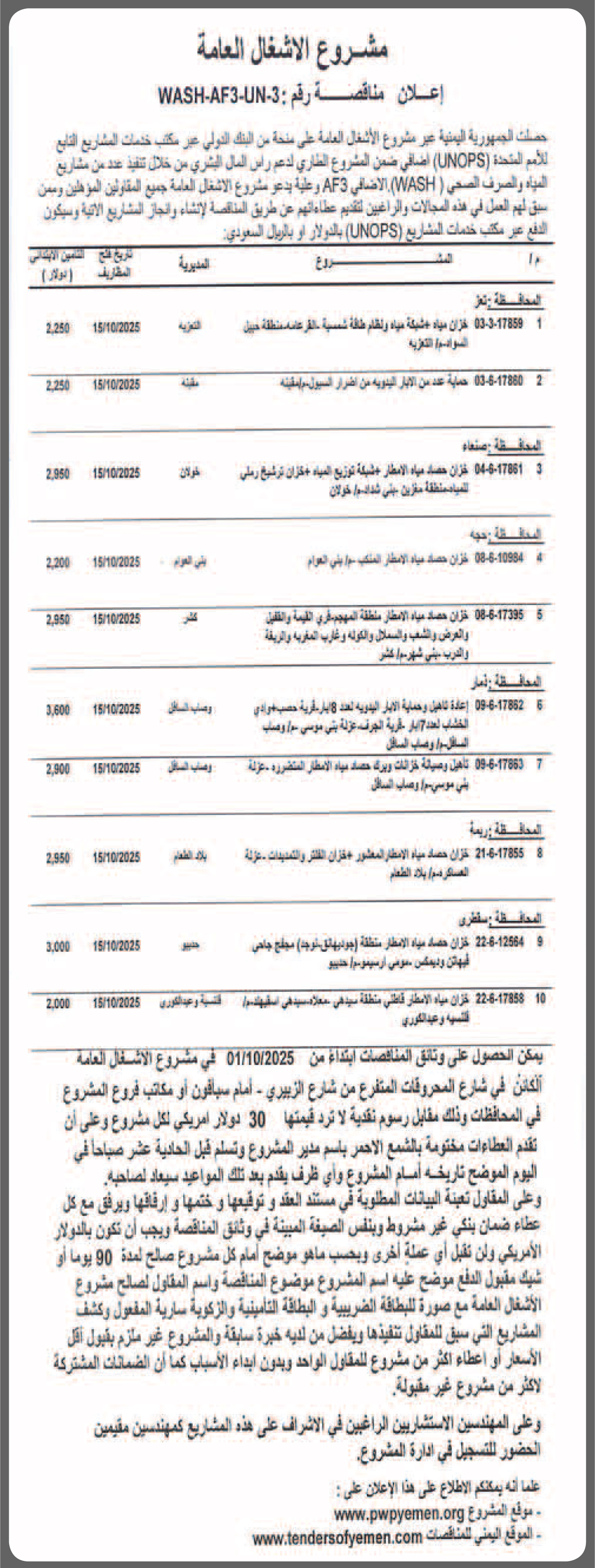 يعلن مشروع الأشغال العامة عن إنزال مناقصة عامة رقم WHSH-AF3-UN-3 إعلاناتمناقصات On أكتوبر 2, 2025 Share Share FacebookTwitterWhatsAppTelegramGoogle+البريد الإلكترونيPrint