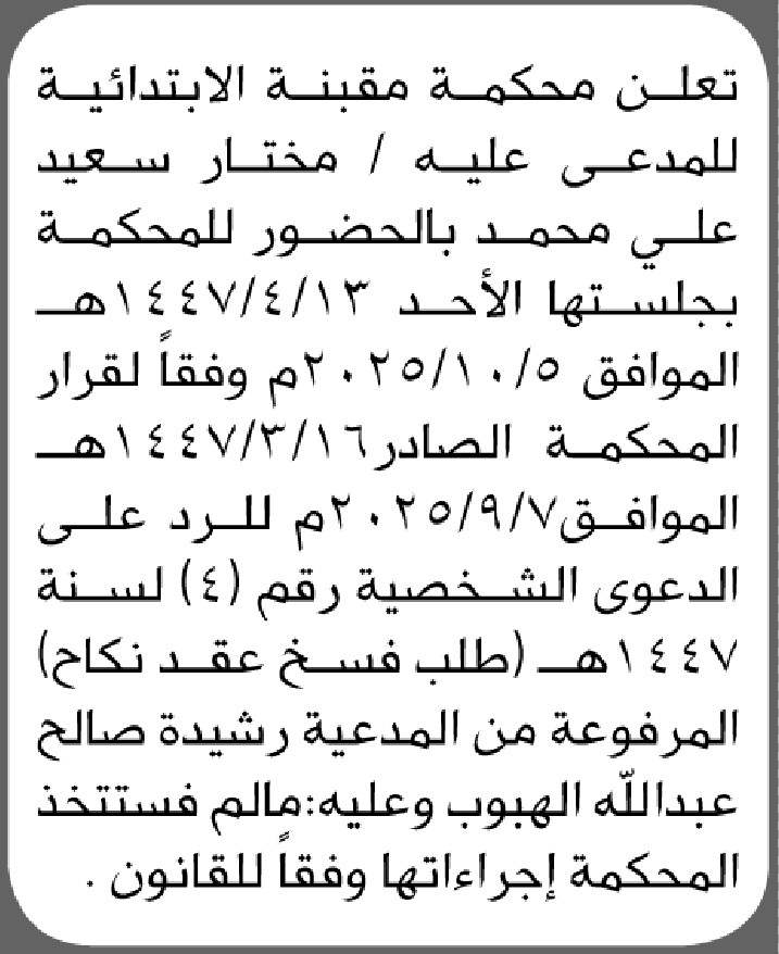 تعلن محكمة مقبنة الإبتدائية للمدعي عليه مختار سعيد محمد الحضور الى المحكمة إعلاناتمحاكم On أكتوبر 2, 2025 Share Share FacebookTwitterWhatsAppTelegramGoogle+البريد الإلكترونيPrint