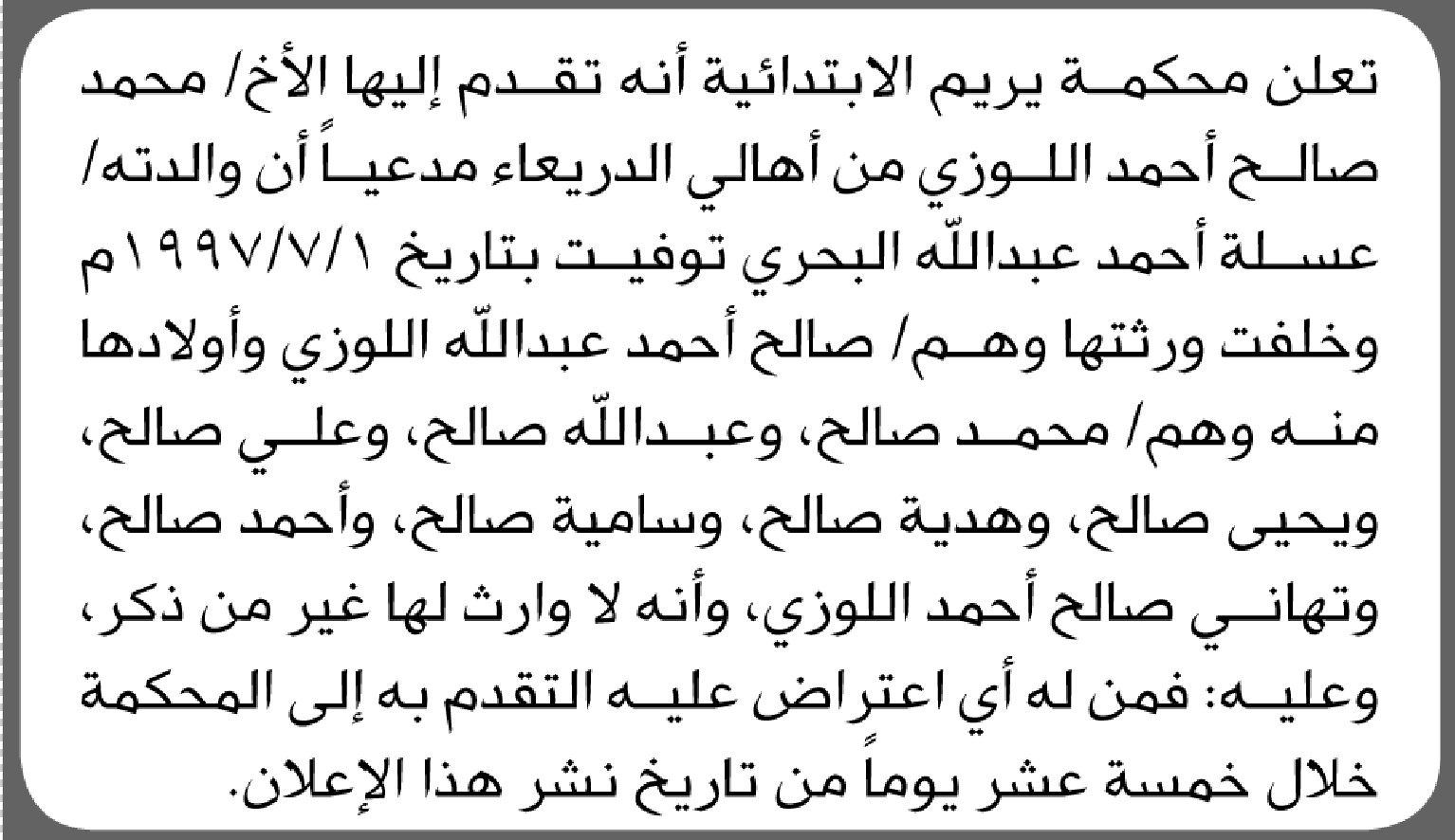 تعلن محكمة يريم الابتدائية بأن الأخ/ محمد اللوزي تقدم إليها بطلب انحصار وراثة والدته إعلاناتمحاكم On أكتوبر 2, 2025 Share Share FacebookTwitterWhatsAppTelegramGoogle+البريد الإلكترونيPrint
