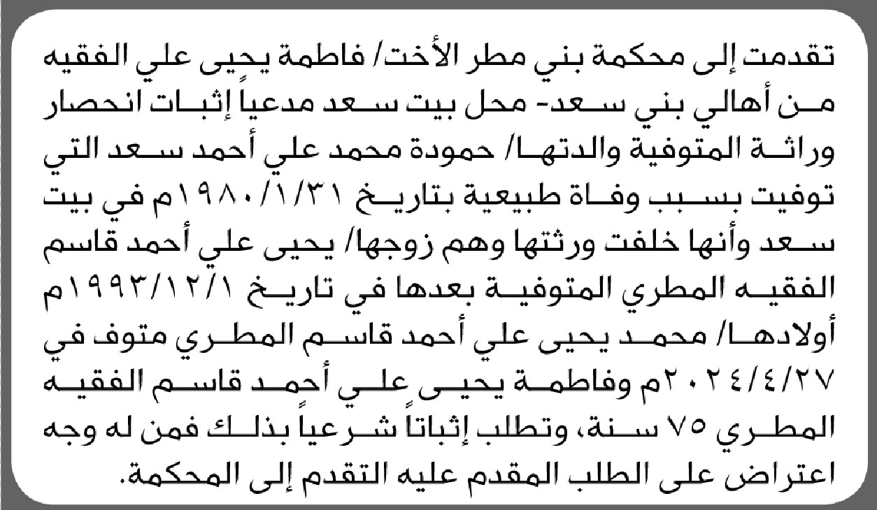 تعلن محكمة بني مطر الابتدائية بأن الأخت/ فاطمة الفقيه تقدم إليها بطلب انحصار وراثة والدتها إعلاناتمحاكم On أكتوبر 2, 2025 Share Share FacebookTwitterWhatsAppTelegramGoogle+البريد الإلكترونيPrint