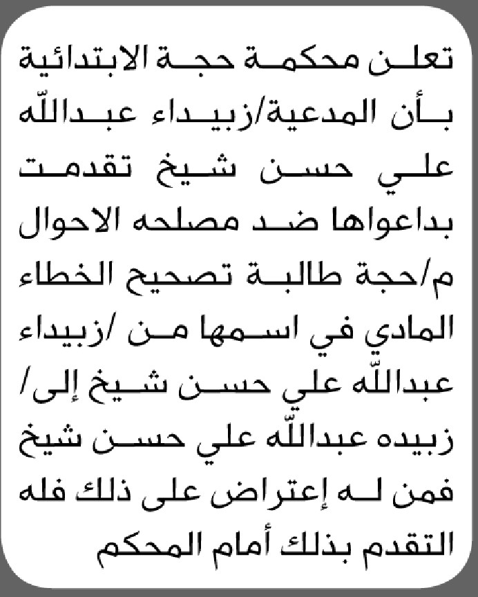 تعلن محكمة حجة انه تقدمت اليها الأخت زبيداء عبدالله بدعوى طلب تصحيح اسمها إعلاناتمحاكم On أكتوبر 3, 2025 Share Share FacebookTwitterWhatsAppTelegramGoogle+البريد الإلكترونيPrint