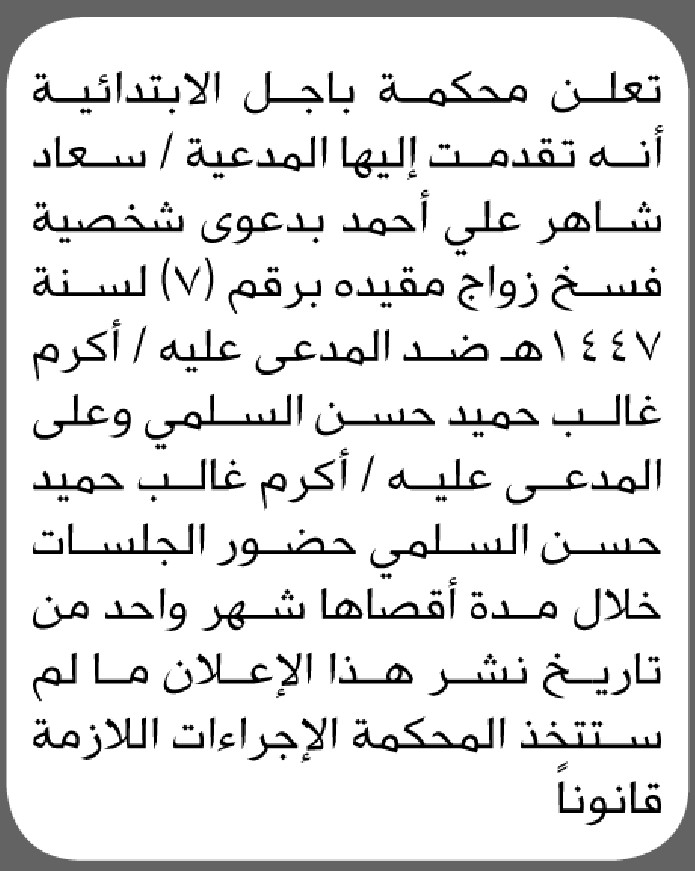 تعلن محكمة باجل ان على المدعى عليه اكرم السلمي الحضور إلى المحكمة إعلاناتمحاكم On أكتوبر 3, 2025 Share Share FacebookTwitterWhatsAppTelegramGoogle+البريد الإلكترونيPrint