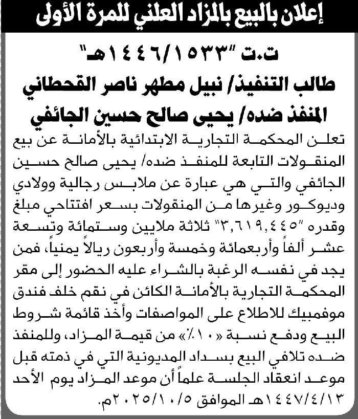 تعلن المحكمة التجارية بالأمانة عن بيع المنقولات التابعة للمنفذ ضده يحيى الجائفي إعلاناتمحاكم On أكتوبر 3, 2025 Share Share FacebookTwitterWhatsAppTelegramGoogle+البريد الإلكترونيPrint