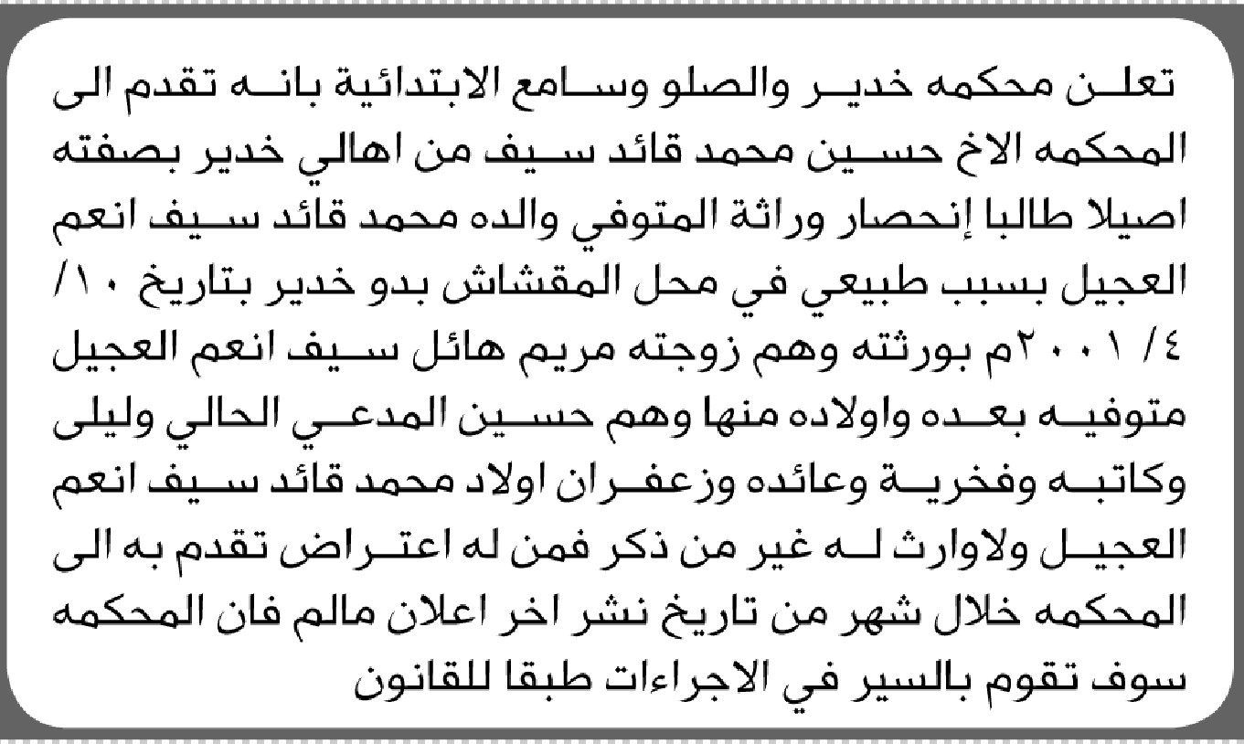 تعلن محكمة خدير والصلو وسامع أن الأخ حسين محمد قائد سيف تقدم بدعوى انحصار وراثة إعلاناتمحاكم On أكتوبر 3, 2025 Share Share FacebookTwitterWhatsAppTelegramGoogle+البريد الإلكترونيPrint