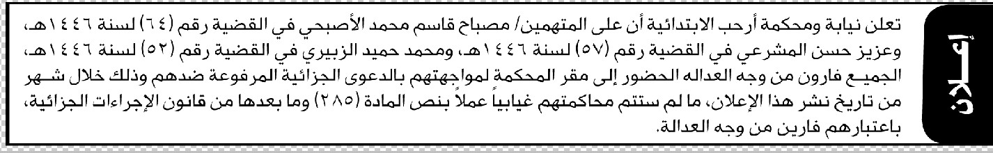تعلن نيابة ومحكمة أرحب أن على المتهمين مصباح قاسم الأصبحي وآخرين الحضور إلى المحكمة إعلاناتمحاكم On أكتوبر 3, 2025 Share Share FacebookTwitterWhatsAppTelegramGoogle+البريد الإلكترونيPrint