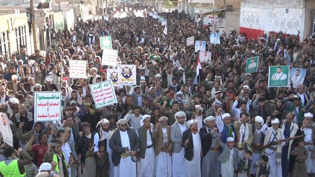 وهتفت الجموع المحتشدة ضد أمريكا التي تدعم الكيان الصهيوني، مبينة أنه لا نصر بدون جهاد، مباركين العمليات العسكرية المتصاعدة التي تنفذها القوات المسلحة اليمنية ضد الكيان الصهيوني.