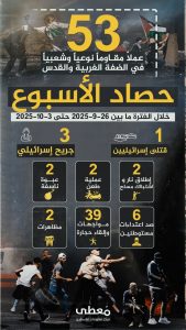 أفاد مركز معلومات فلسطين (معطى)، اليوم الجمعة، بوقوع 53 عملاً مقاوماً نوعياً وشعبياً في الضفة والقدس المحتلة، خلال أسبوع وتحديداً في الفترة ما بين 26 سبتمبر المنصرم وحتى 2 أكتوبر الجاري.