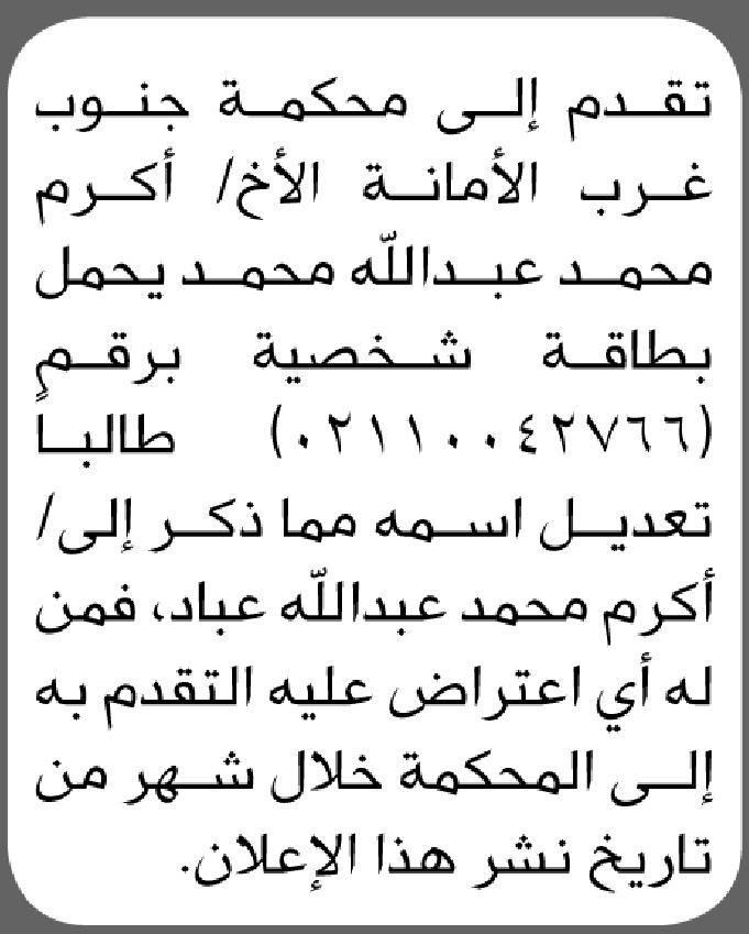 تقدم الى محكمة جنوب غرب الأمانة الأخ اكرم محمد بطلب تعديل اسمه إعلاناتمحاكم On أكتوبر 4, 2025 Share Share FacebookTwitterWhatsAppTelegramGoogle+البريد الإلكترونيPrint