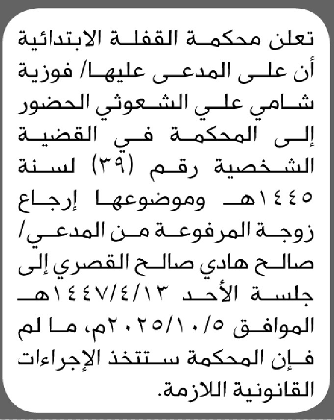 تعلن محكمة القفلة ان على المدعى عليها فوزية الشعوثي الحضور إلى المحكمة إعلاناتمحاكم On أكتوبر 4, 2025 Share Share FacebookTwitterWhatsAppTelegramGoogle+البريد الإلكترونيPrint