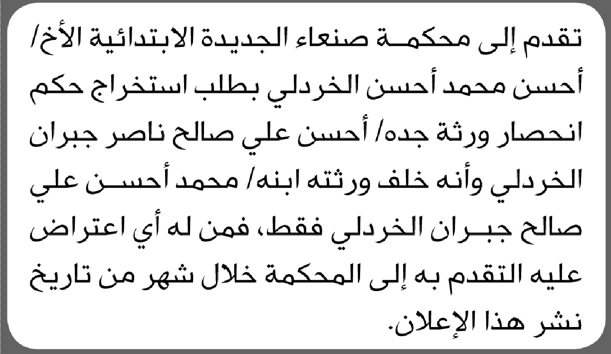 تعلن محكمة صنعاء الجديدة أن الأخ أحسن محمد الخردلي تقدم بدعوى انحصار وراثة إعلاناتمحاكم On أكتوبر 4, 2025 Share Share FacebookTwitterWhatsAppTelegramGoogle+البريد الإلكترونيPrint