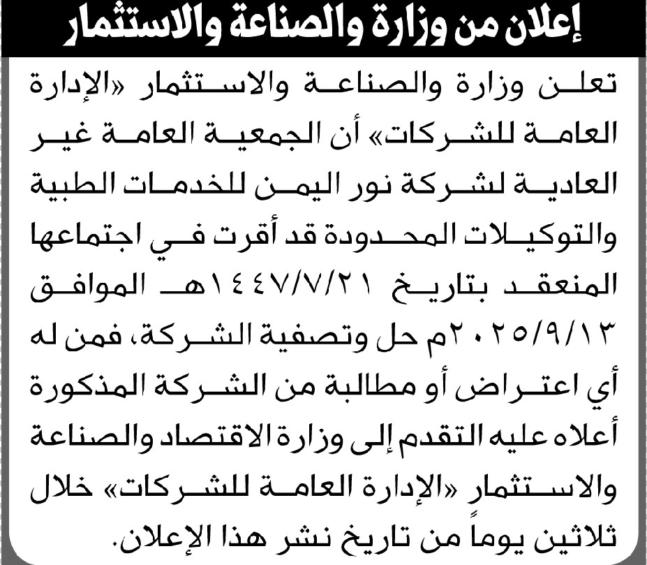 تعلن وزارة الصناعة أن شركة نور اليمن للخدمات الطبية أقرت حل وتصفية الشركة إعلاناتاخرى On أكتوبر 4, 2025 Share Share FacebookTwitterWhatsAppTelegramGoogle+البريد الإلكترونيPrint