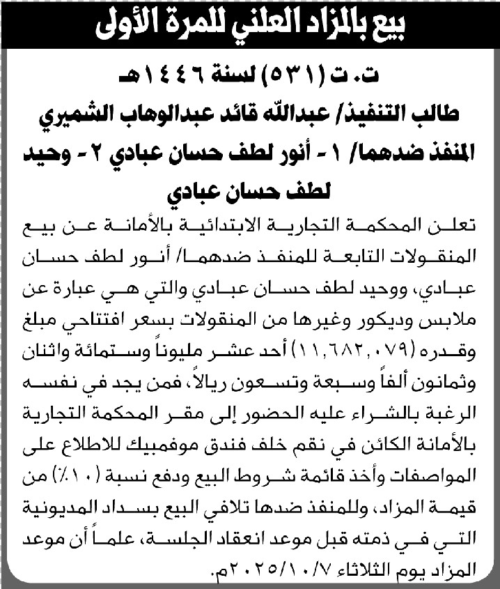 تعلن المحكمة التجارية الابتدائية بالأمانة عن بيع بالمزاد العلني لمنقولات المنفذ ضدهما/ أنور ووحيد لطف عباد إعلاناتمحاكم On أكتوبر 5, 2025 Share Share FacebookTwitterWhatsAppTelegramGoogle+البريد الإلكترونيPrint