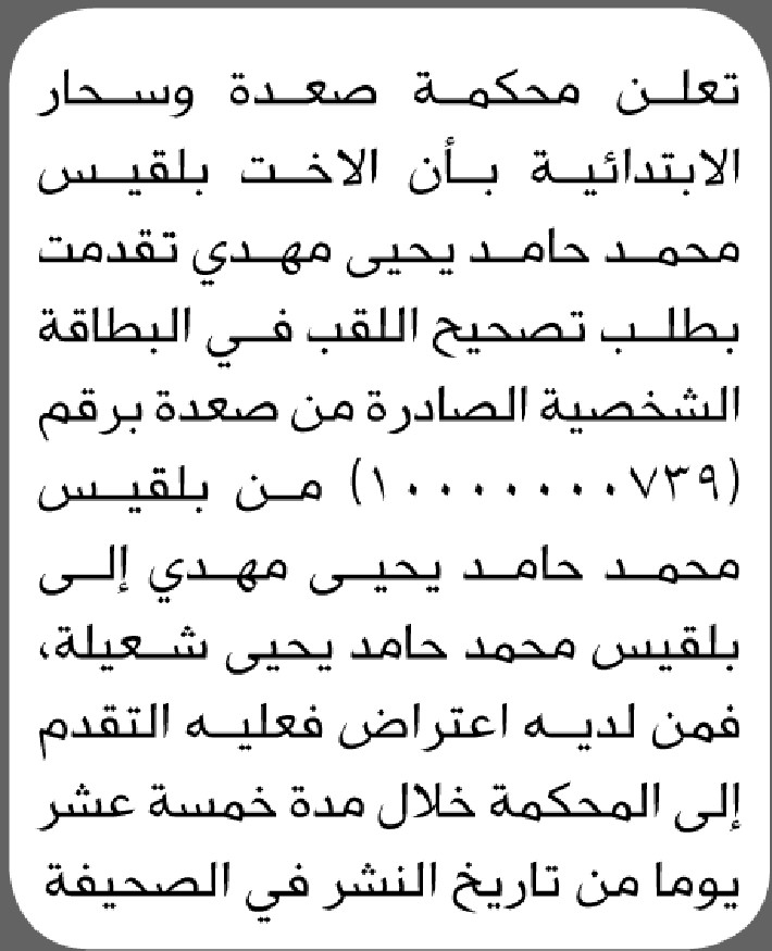 تعلن محكمة صعده وسحار بأن الأخت بلقيس مهدي تقدمت بطلب تصحيح لقب إعلاناتمحاكم On أكتوبر 5, 2025 Share Share FacebookTwitterWhatsAppTelegramGoogle+البريد الإلكترونيPrint
