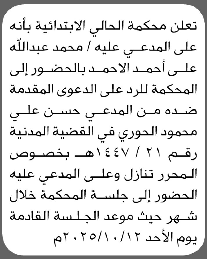 تعلن محكمة الحالي الابتدائية بأن على المدعي عليه محمد الاحمد الحضور الى المحكمة إعلاناتمحاكم On أكتوبر 5, 2025 Share Share FacebookTwitterWhatsAppTelegramGoogle+البريد الإلكترونيPrint